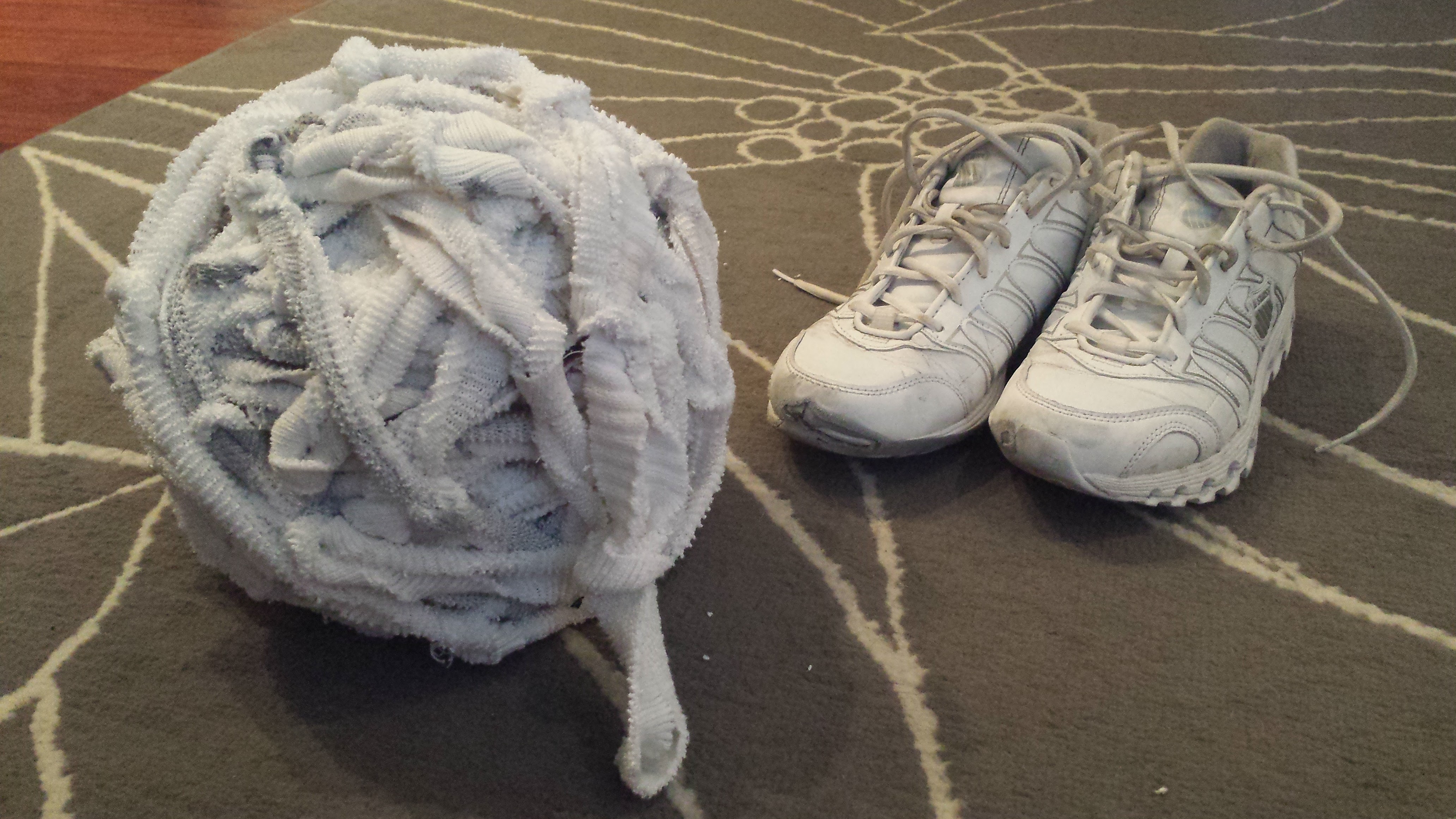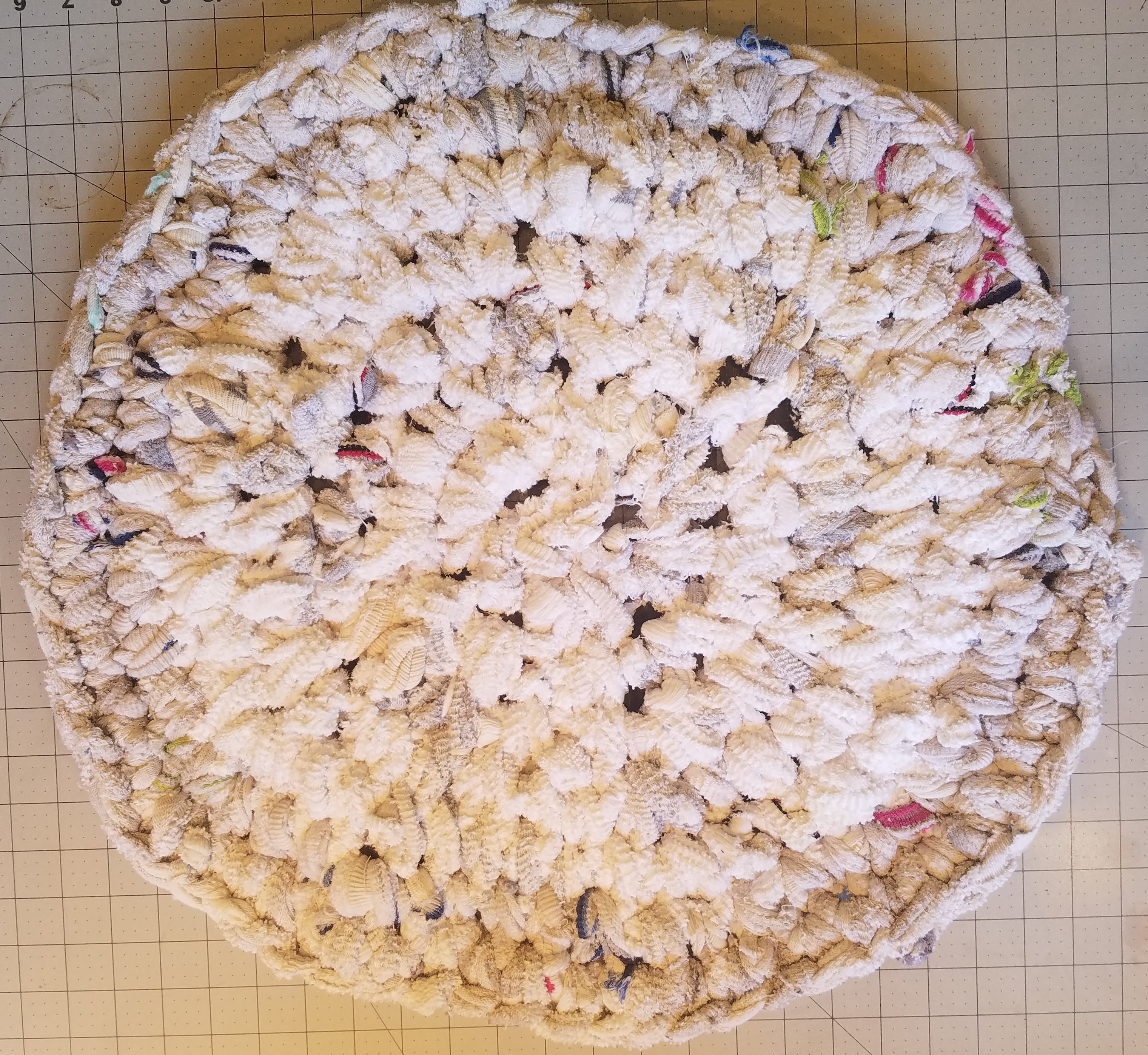 The same amount of envelopes could make a small waterproof anti-fatigue mat or bathroom mat (the envelopes are waterproof and the bubble wrap that lines the envelopes is cushy) or a fruit basket (make a bigger circle or oval before turning up side and use more increases to flare shape out faster. If you don’t like the blue and white color scheme, spray paint the finished product with Rustoleum plastic paint.