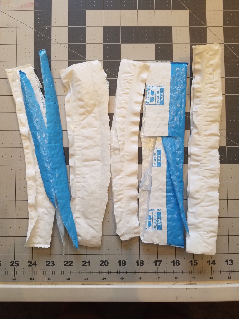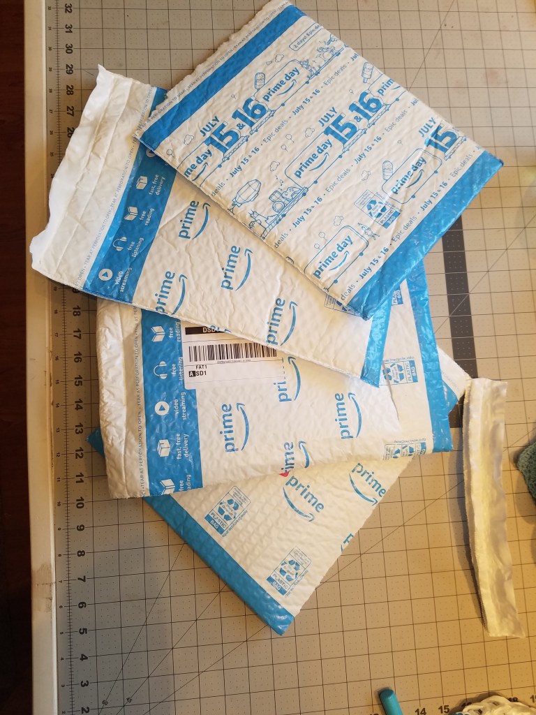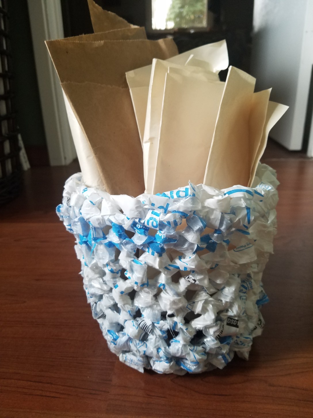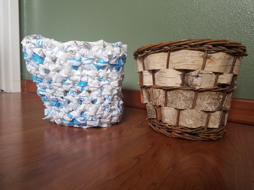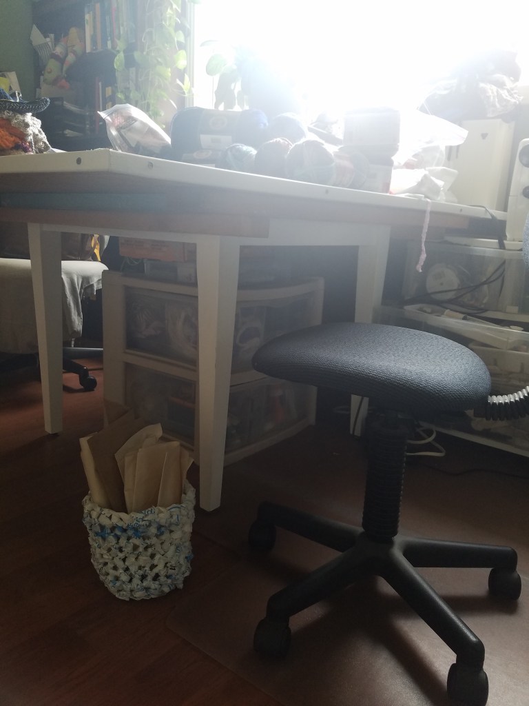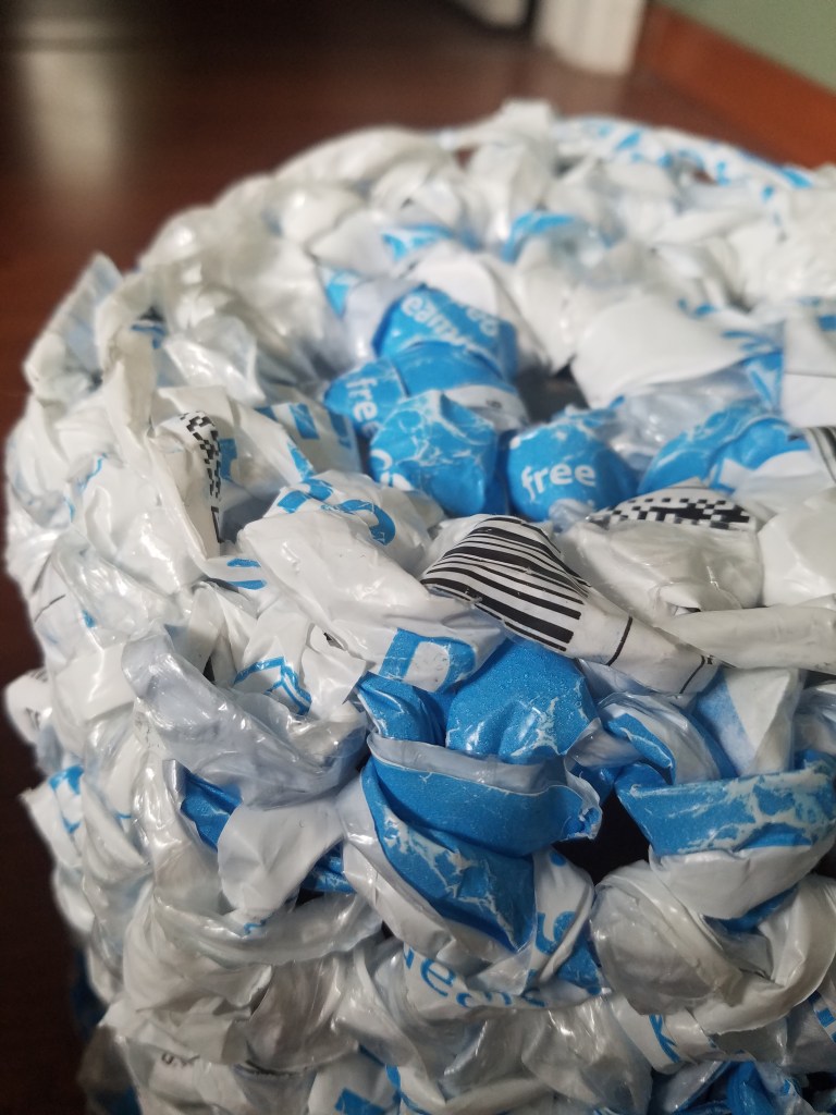 Ever since I started this blog I see the world around me differently. Looking at anything I am thinking of throwing in the trash or recycling, I say to myself, “Can I crochet something with it?” After a recent Prime Day feeding frenzy, I was tossing a fifth blue-and-white padded plastic envelope on the guest room bed (to postpone the inevitable) when the thought struck me: a waste-paper basket! Made of waste plastic!